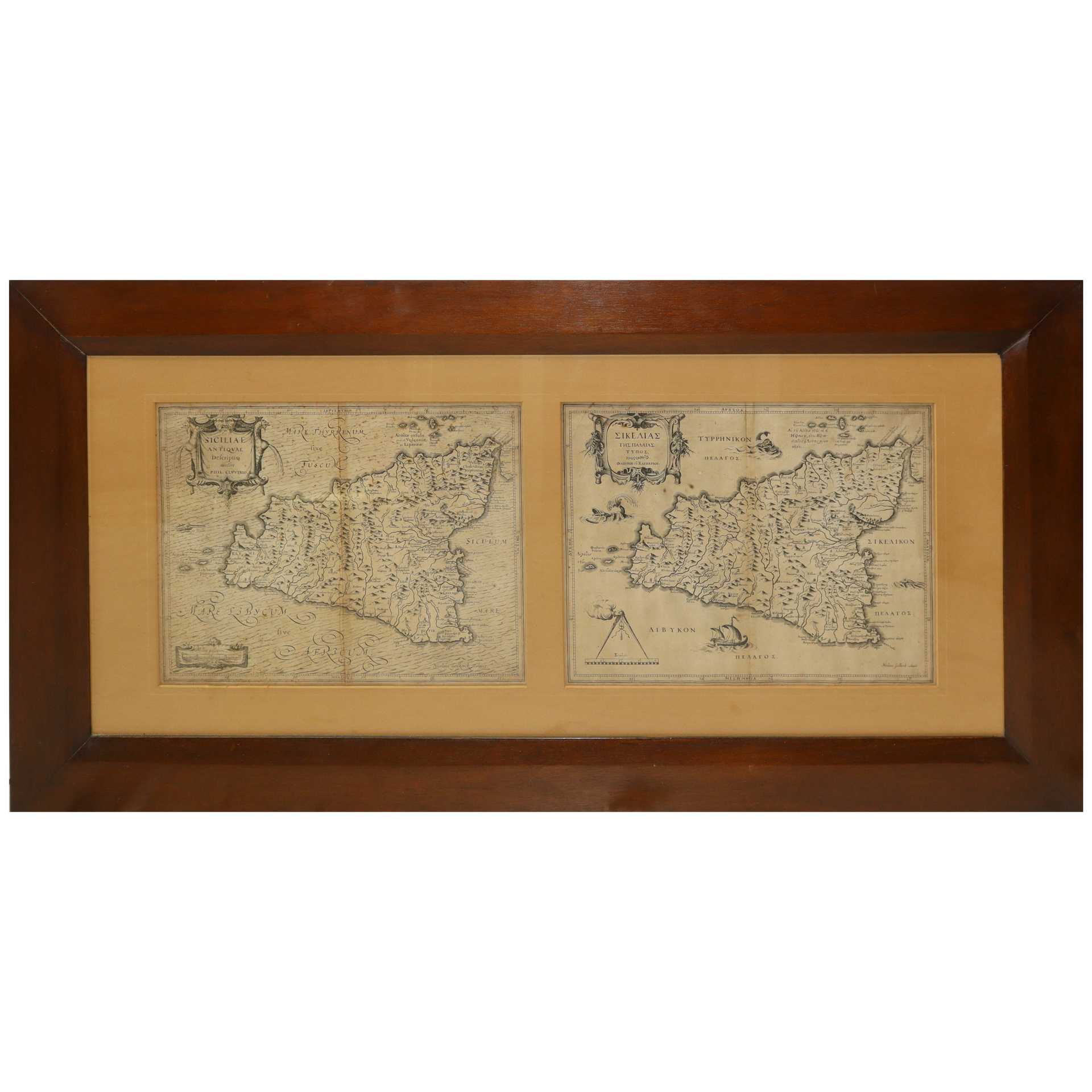 Coppia di carte geografiche della Sicilia, Siciliae Antiquae descriptio Ciascuna carta geografica cm 29x38 - In cornice cm 56x109