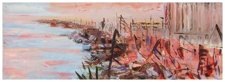 CORRADO GAI Livorno 1977 Il porto durante la guerra Olio su tela 25 x 70. Firme e titolo sul verso. Pubbl.: “Il Surreailismo di Corrado Gai – Nuova espressione e nuovo linguaggio per l’Uomo contemporaneo” cat. dell’artista, stampato da Arti Grafiche Federico Frediani, Livorno, pp.38, 39.