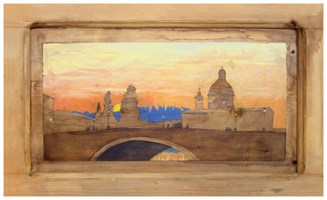 MASSIMO LOMI Livorno 1953 Giù il sipario a Ponte alla Carraia 2013 Tempera su tavola 45 x 74,5. Titolo e firma in b. a d.; sul verso etichette e timbro studio dell’artista.