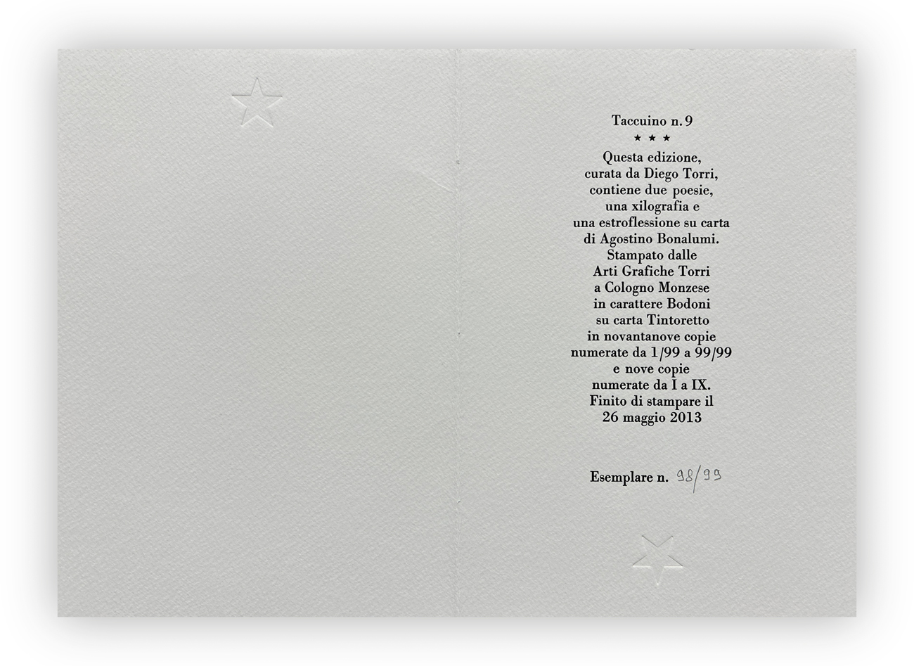 Edizione d'Arte, curata da Diego Torri, contenente due poesie ed una xilografia su cartoncino Tintoretto di Agostino Bonalumi recante firma e numerazione (Esemplare 98/99) a matita al fronte