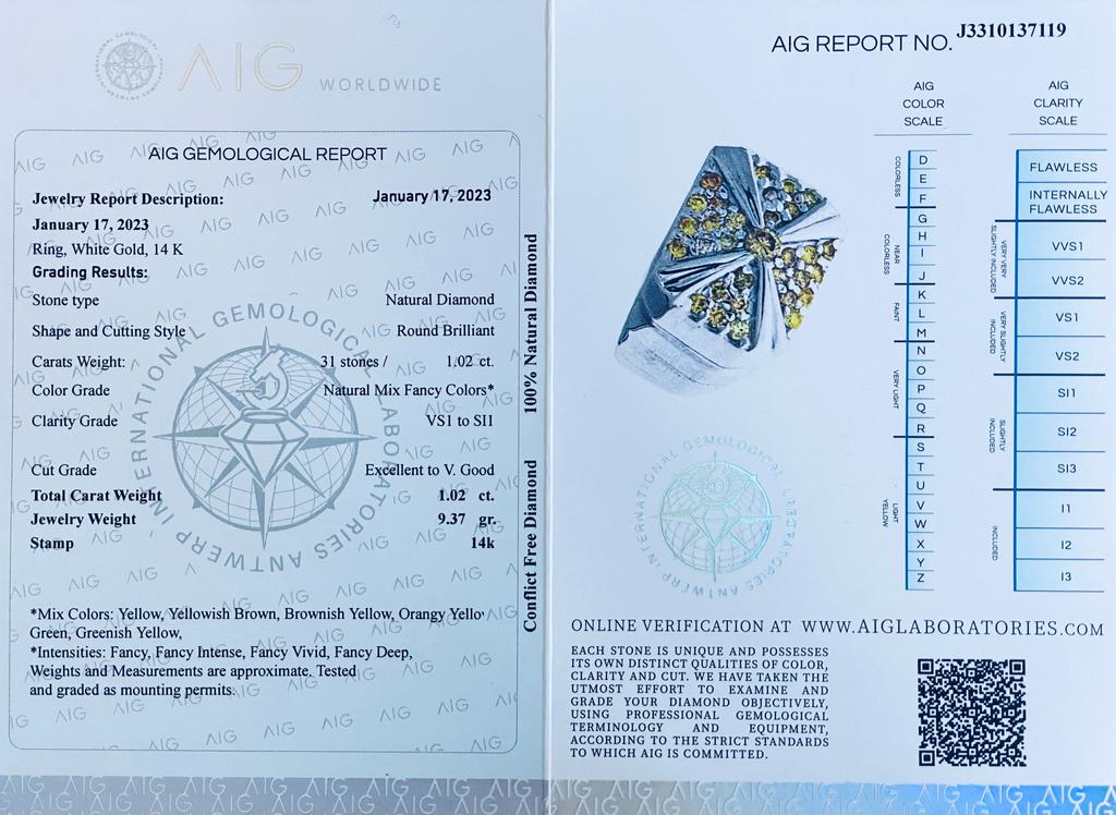 ANELLO IN ORO BIANCO 14K 9.37 GR CON DIAMANTI PER 1.02 CARATI COLORE FANCY GIALLO INTENSO - PUREZZA VS-SI TAGLIA - 9.5 CERTIFICATO AIG - RNG30102