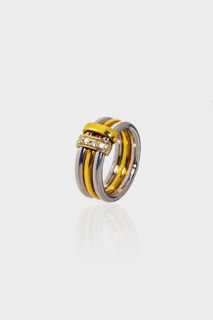 composto da tre fasce in oro giallo e bianco(ammaccature) al centro quattro diamanti taglio brillante per totali ct 0,05 ca