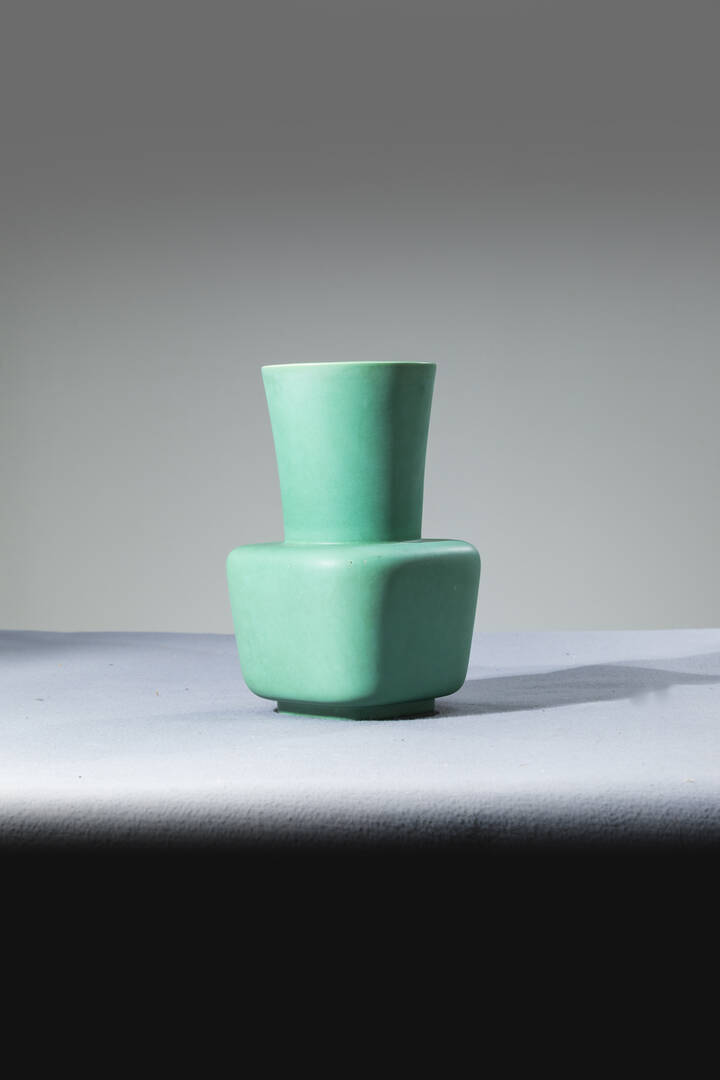 Vaso a sezione quadrata con alto collo in colaggio a smalto.