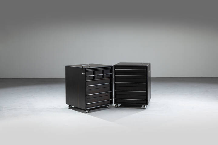 Due elementi orientabili incernierati fra loro in legno massello, multistrato lastronato, maniglie in acciaio cromato.