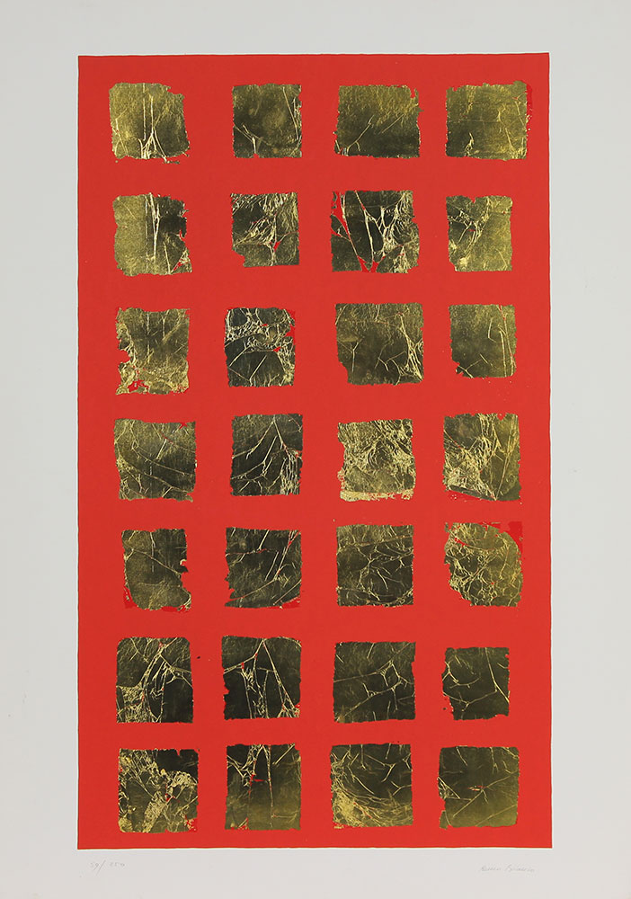 Bianco Remo Tableau d'oré, 1970-1975 serigrafia con applicazioni di foglia oro su carta, cm. 69x49, es. 59/250 firmata in basso a destra senza cornice