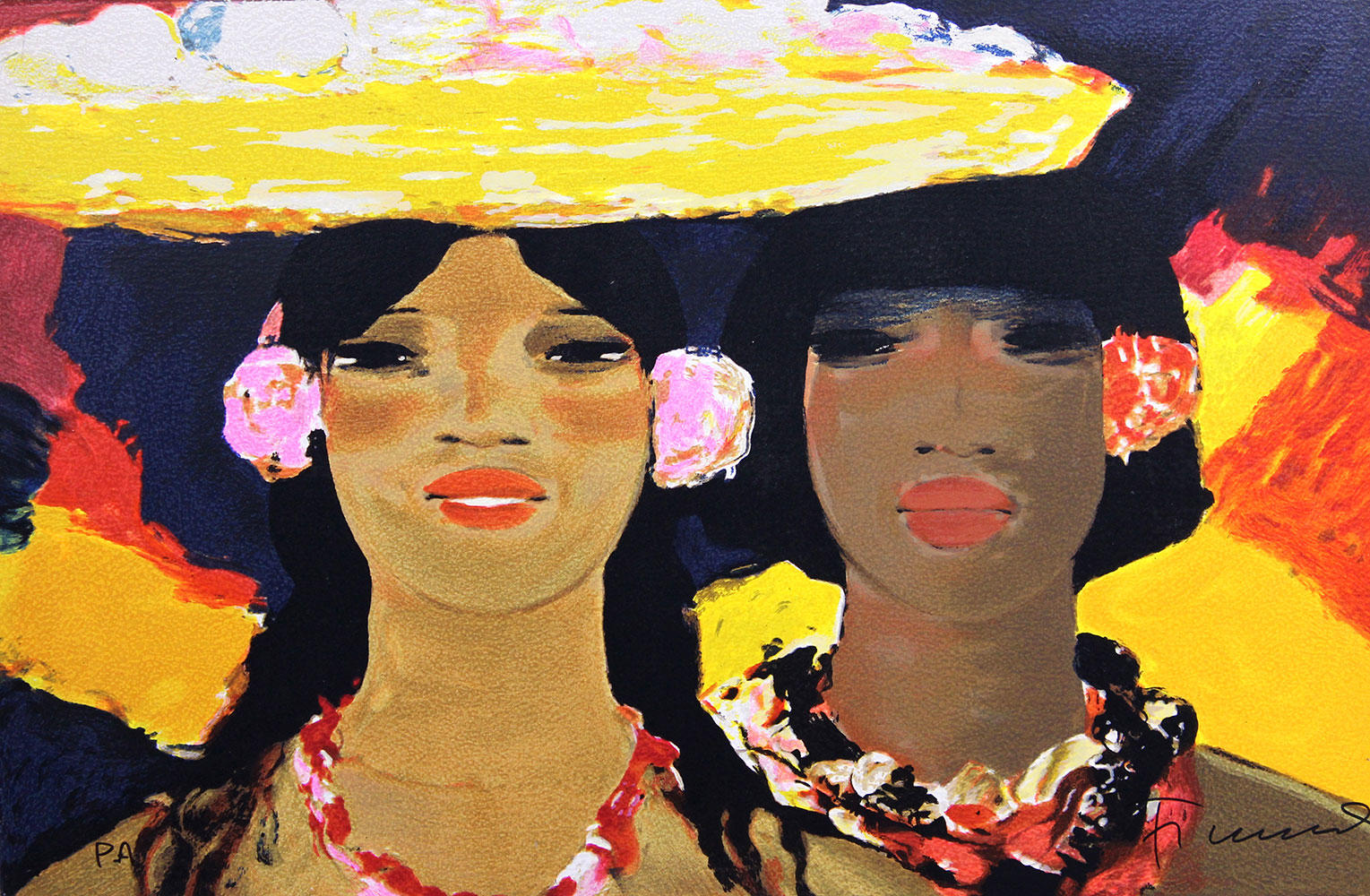 Fiume Salvatore Ragazze tahitiane serigrafia su faesite, cm. 53x79,5, es. prova d'autore firmata in basso a destra, timbro D.G.A. di Treviso al retro senza cornice
