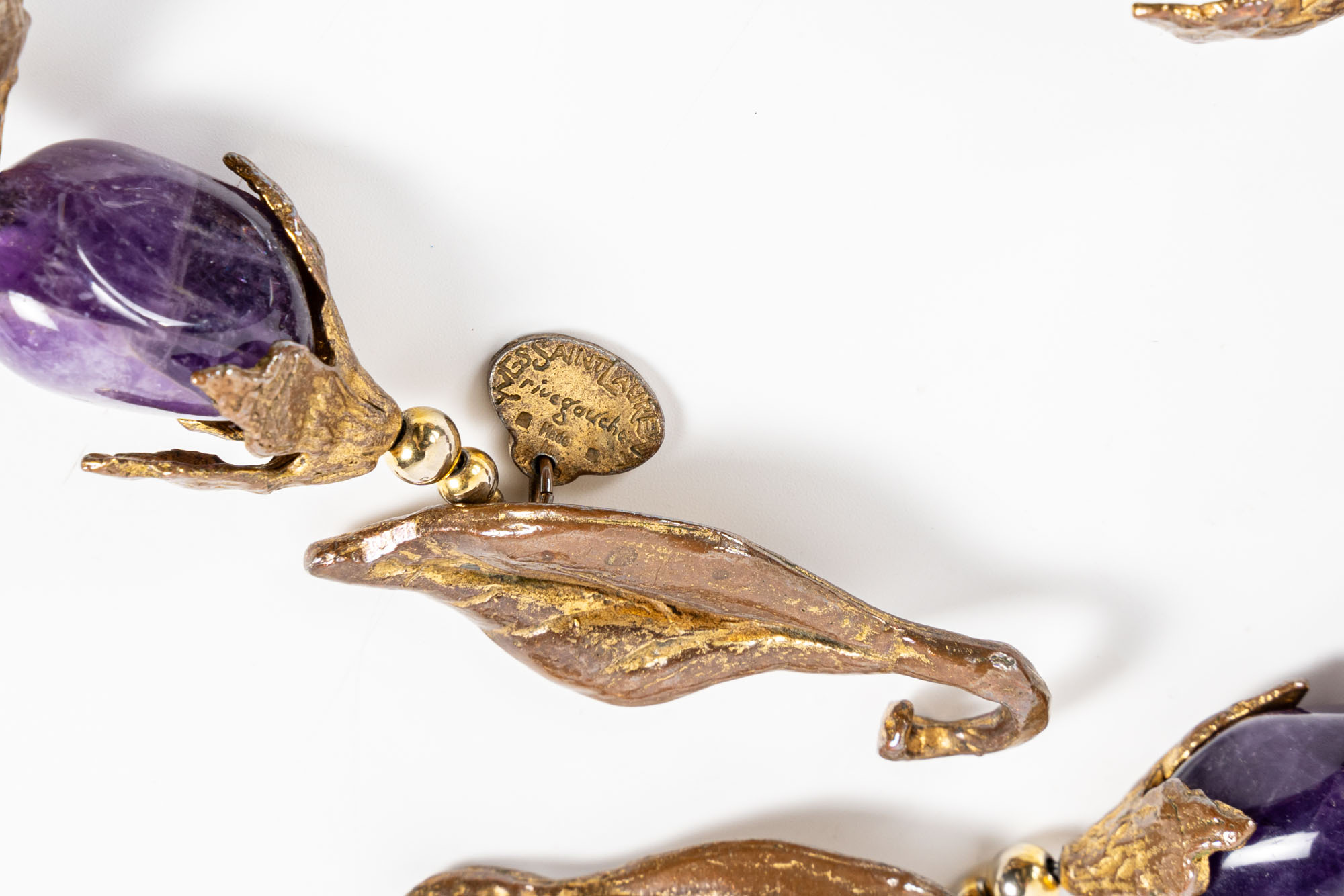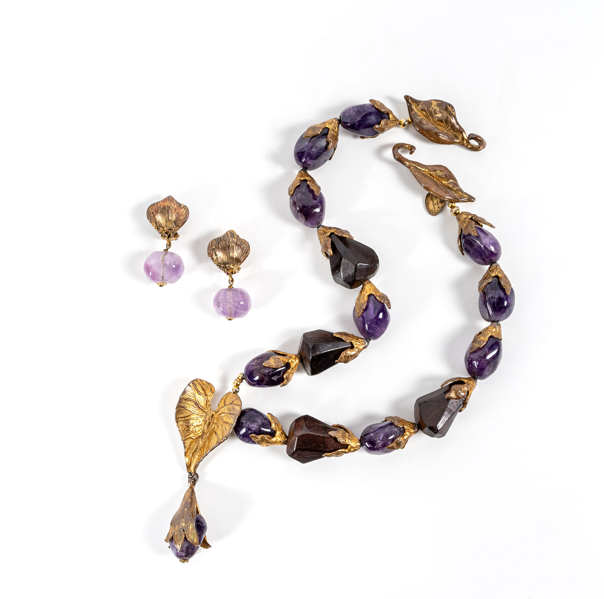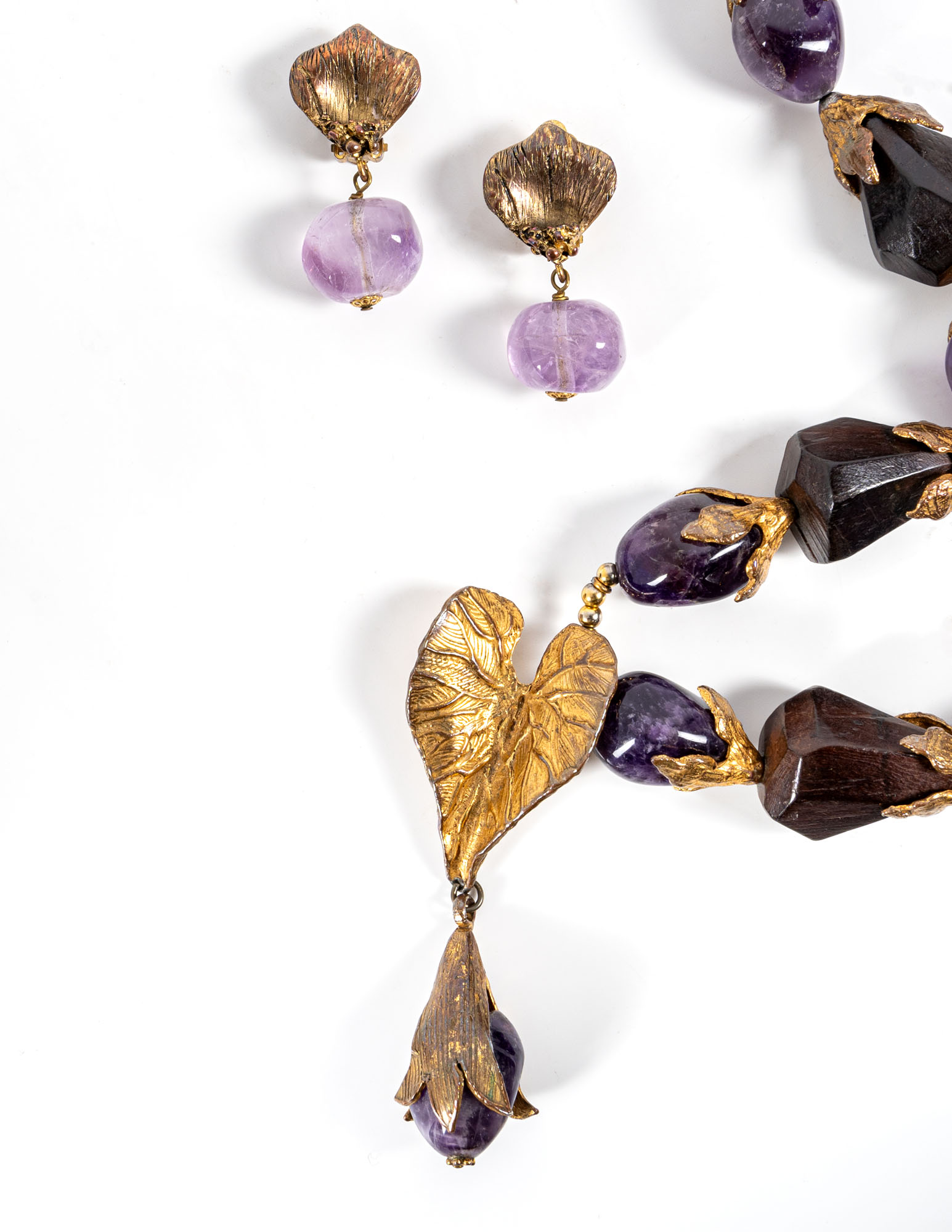 YVES SAINT LAURENTCollana e orecchini vintage 'Rive Gauche'Anni '80Collana in metallo dorato, ametiste e legnoOrecchini pendenti con chiusura a clip in metallo dorato e ametisteLunghezza orecchini 4,5 cmCorredati di sacchettoIn ottime condizioni vintage