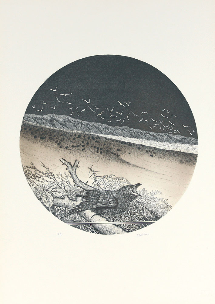 Giannini Giuseppe Senza titolo, 1977 incisione su carta, lastra cm. 70x50, diam. cm. 40, es. prova d'autore firmata e datata in basso a destra, timbro a secco La Tavolozza in basso a destra