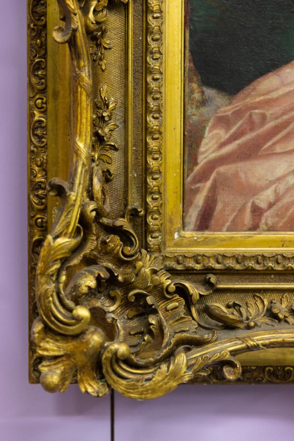 Fanciulla con gattino, XIX secolo Olio su tela 90x80 cm Cornice in ramage...