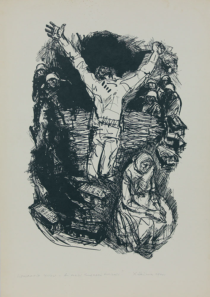 Neicov Xristo Ai poeti bulgari fucilati, 1976 litografia su carta, cm. 70x50, es. 4/120 intitolata, firmata e datata in basso, timbro a secco Cooperativa Opera Artistica Modena in basso a destra, certificato di garanzia della Cooperativa per la Diffusione dell'Opera Artistica di Modena al retro