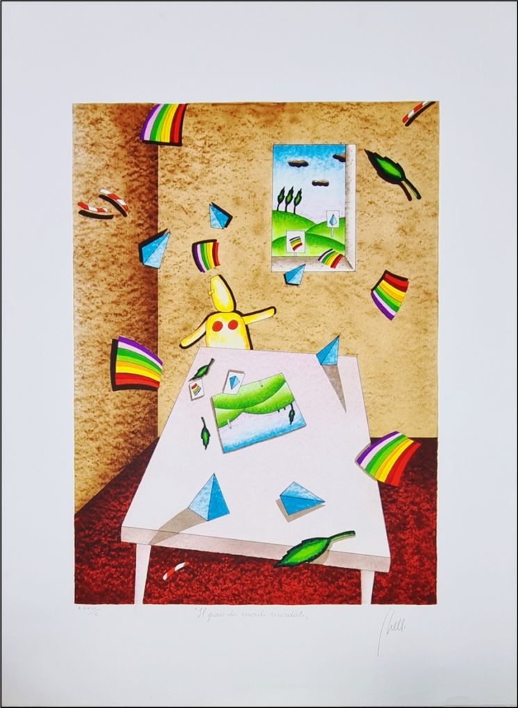GHELLI GIULIANO Firenze 1944 - 2014 "Il gioco dei ricordi ricordati" Serigrafia su cartoncino cm 50x70. Firmata sul fronte in basso a destra, intitolata al centro e numerata a sinistra.