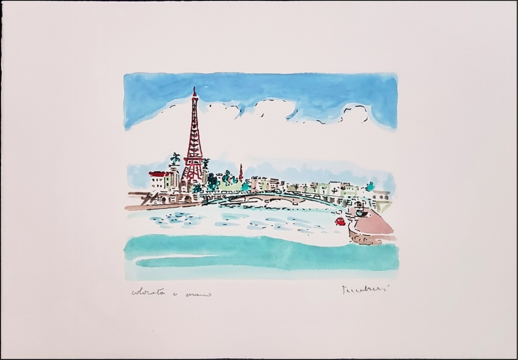 TAMBURI ORFEO Jesi 1910 - Parigi 1994 "Senza titolo" Incisione serigrafica acquerellata a mano, su carta pregiata, cm 50x35, pezzo unico. Firmata sul fronte in basso a destra, dicitura "ritoccata a mano" a sinistra.