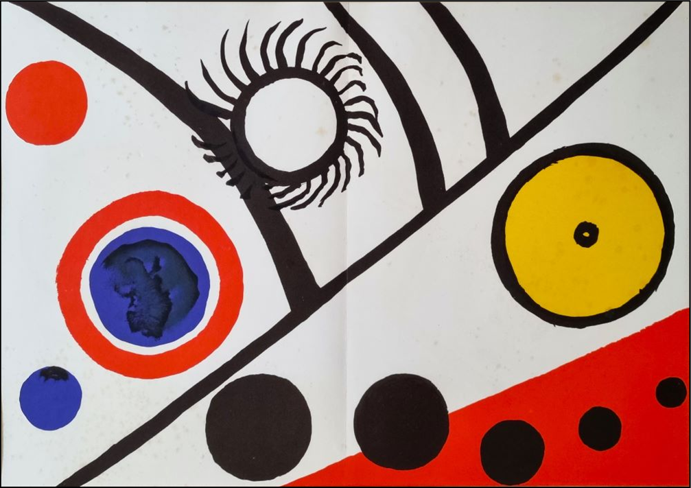 CALDER ALEXANDER Stati Uniti 1898 - New York 1976 "Sole nero" Litografia a colori su carta cm 55,4x37,8 del 1976. Opera non firmata, tavola 3 di Derrière Le Miroir numero 221, con piega centrale citata sul catalogo "Alexander Calder, la girandola dei colori" (presenta piccole fioriture).