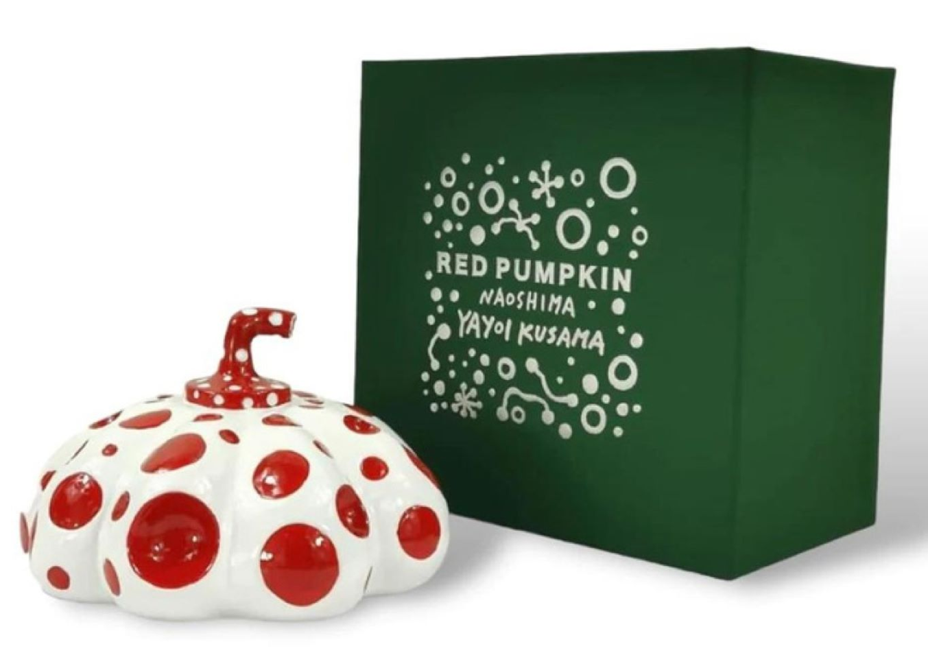 KUSAMA YAYOI Giappone 1929 "Naoshima Pumpkin" Scultura in resina bianca e rossa cm 14x14 (diam.). Contenuta nella sua scatola originale. Firma in stampa alla base.