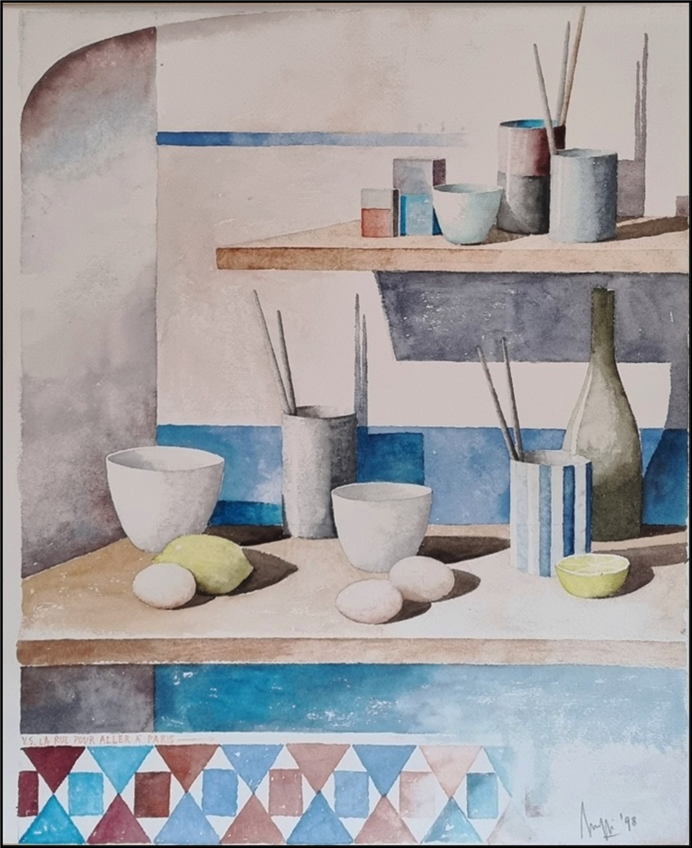 SCUFFI MARCELLO Quarrata 1948 - 2021 "V.S. la rue pour aller a Paris" Acquerello su cartoncino cm 45x54, del 1998. Firmato e datato sul fronte in basso a destra, intitolato a sinistra. Autentica su foto.