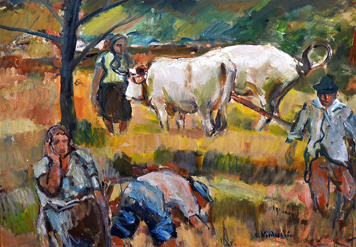 Verdecchia Carlo (Atri, TE 1905 - 1984) Scena di campagna olio su cartone cm 70x100 firmato in basso a destra: C. Verdecchia