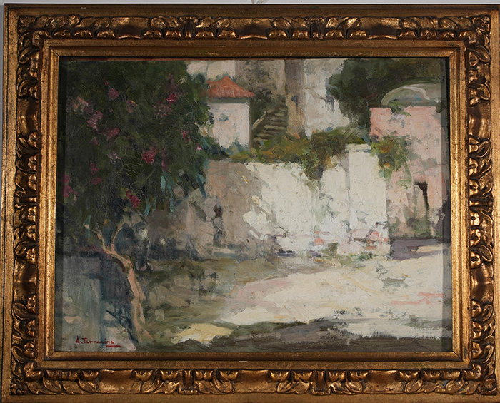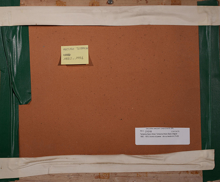 Terracina Arturo Bacio (Napoli 1882 - 1951) Scorcio di paese olio su tavola cm 27x35 firmato in basso a sinistra: A. Terracina
