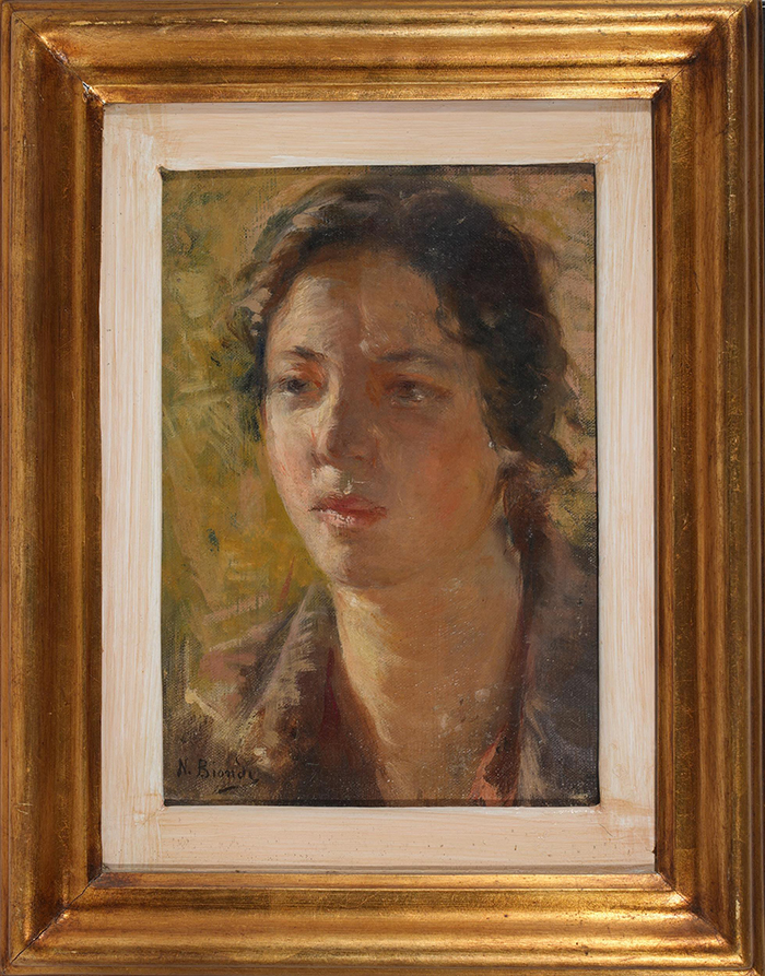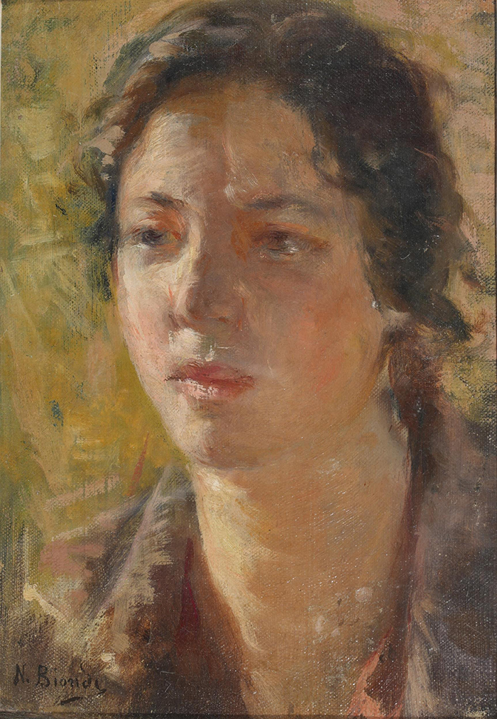 Biondi Nicola (Capua, CE 1866 - Napoli 1929) Volto femminile olio su tela, cm 30,5x31,5 firmato in basso a sinistra: N. Biondi