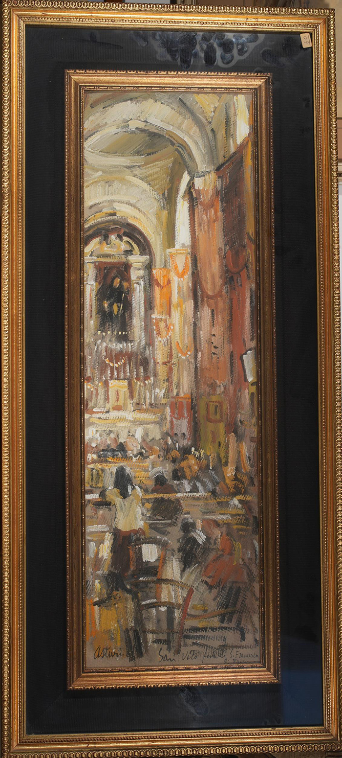 Asturi Antonio (Vico Equense, NA 1904 - 1986) Festa di San Francesco di Paola olio su cartone, cm 71x22 firmato in basso a sinistra: Asturi iscritto in basso a destra