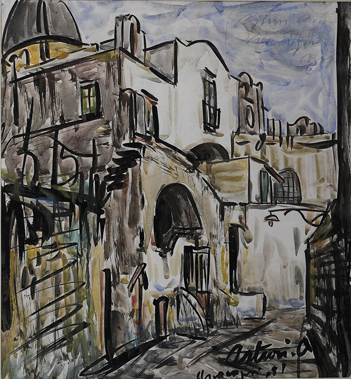 Asturi Antonio (Vico Equense, NA 1904 - 1986) Anacapri tecnica mista su carta, cm 26x24,5 firmato iscritto e datato in basso a destra: Asturi A. Anacapri 81