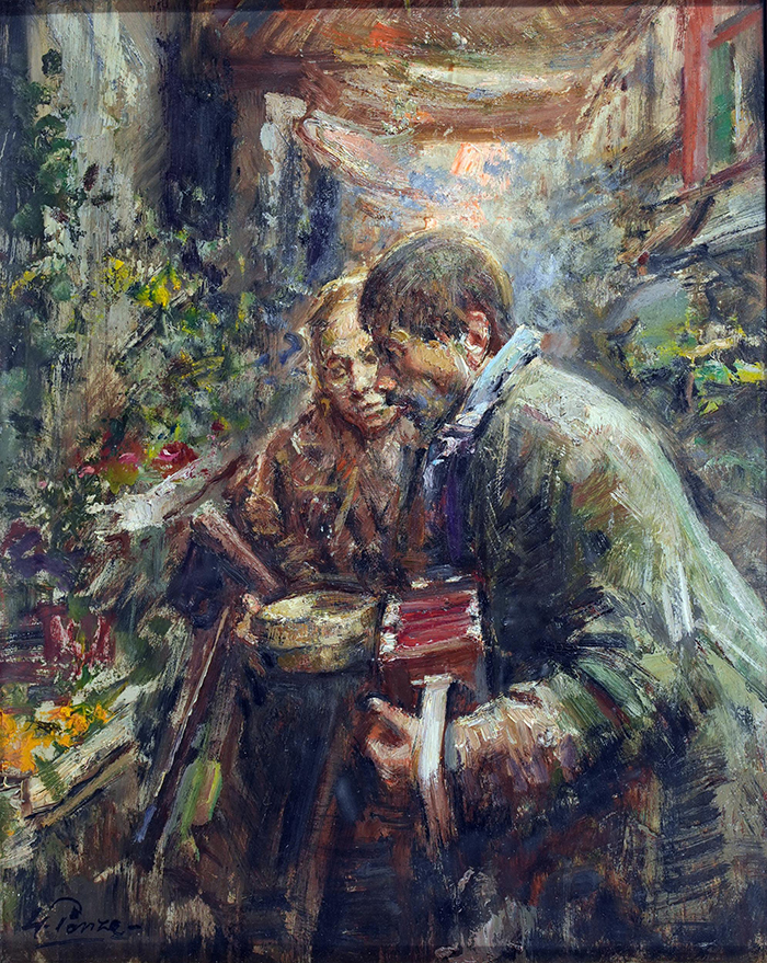 Panza Giovanni (Napoli 1894 - 1989) Musicanti olio su tavola, cm 50,5x40,5 firmato in basso a sinistra: G. Panza