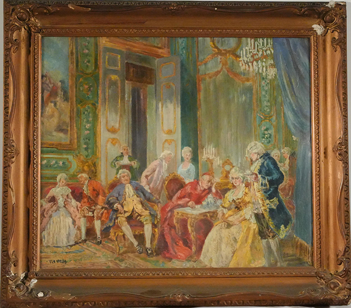 La Bella Vincenzo (Napoli 1872 - 1954) Scena galante olio su cartone, cm 55x64 firmato in basso a sinsitra: V. Labella