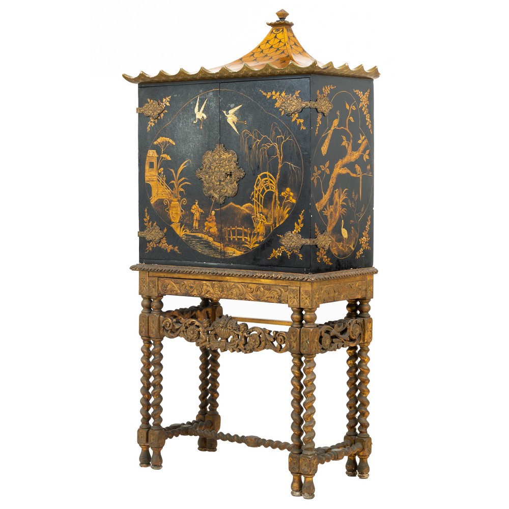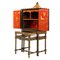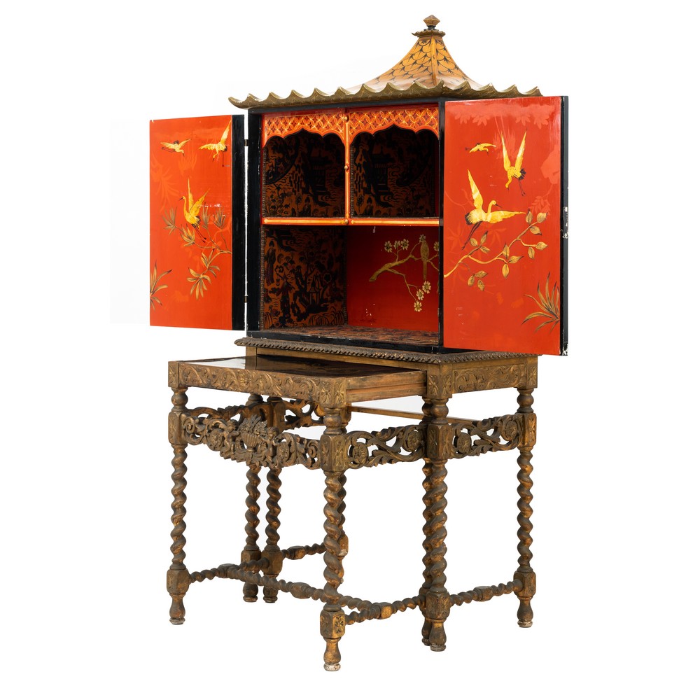 Cabinet a due ante in legno laccato e decorato a motivo floreale e scene di vita, tetto a pagoda e con consolle estraibile in legno laccato e decorato.