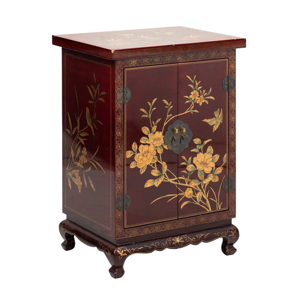 PICCOLO MOBILE a due ante in legno laccato nei toni del rosso con decori a motivo naturalistico (usure).