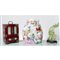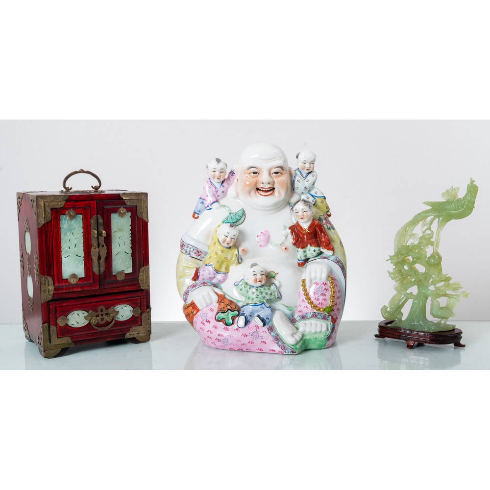 Scultura in porcellana policroma raffigurante "Buddha", scultura in giada raffigurante "Volatile" con base in legno e portagioie in legno di mogano con elementi in bronzo e giada (usure e mancanze).