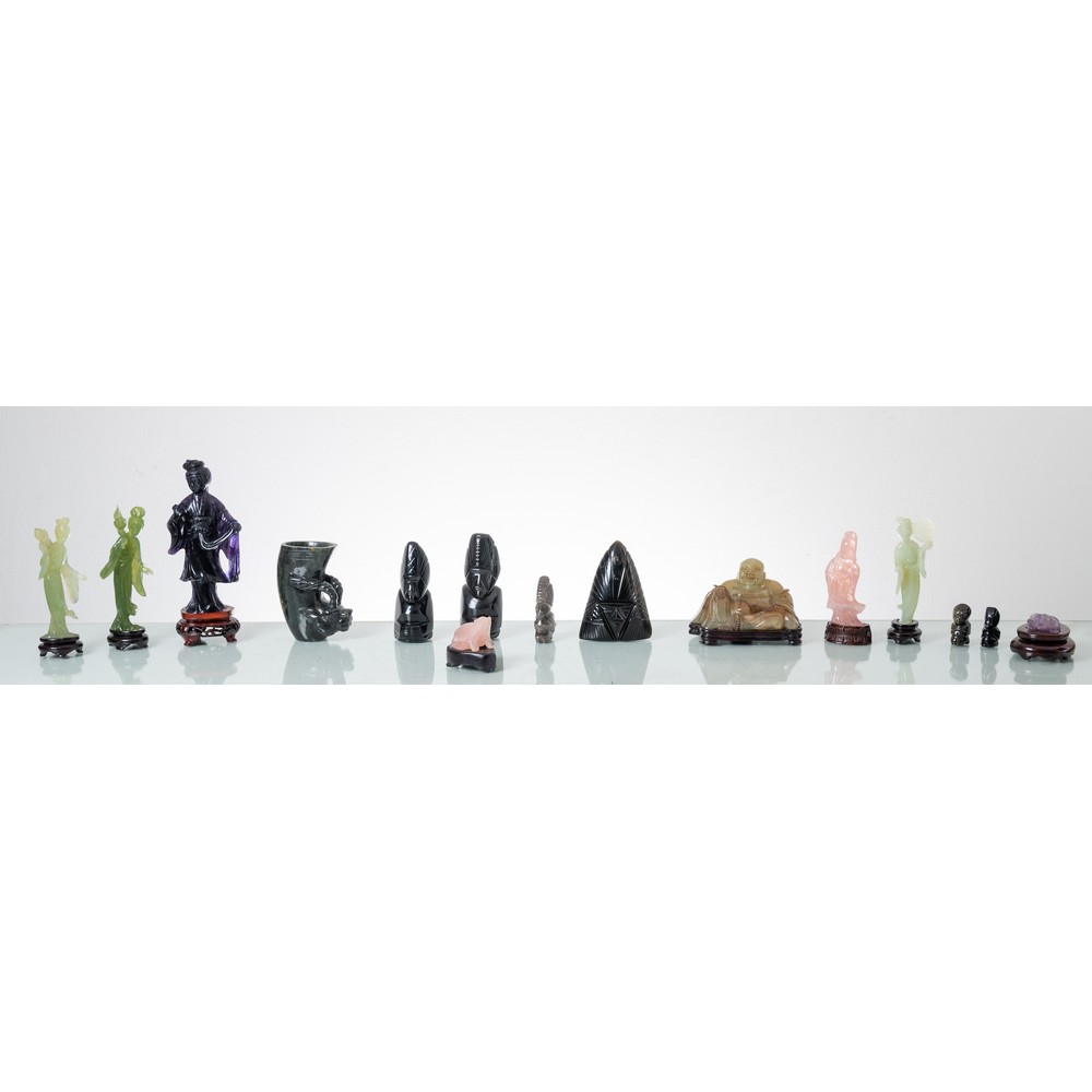 QUINDICI SCULTURE in pietre dure di diversa tipologia in quarzo rosa e giada.