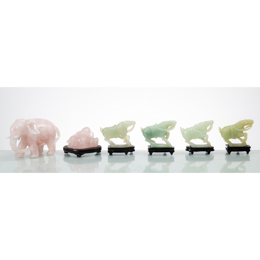 SEI PICCOLE SCULTURE di cui quattro in giada raffiguranti "Cavalli" entro scatola e due raffiguranti "Elefante" e "Buddha" in quarzo rosa (mancanze).
