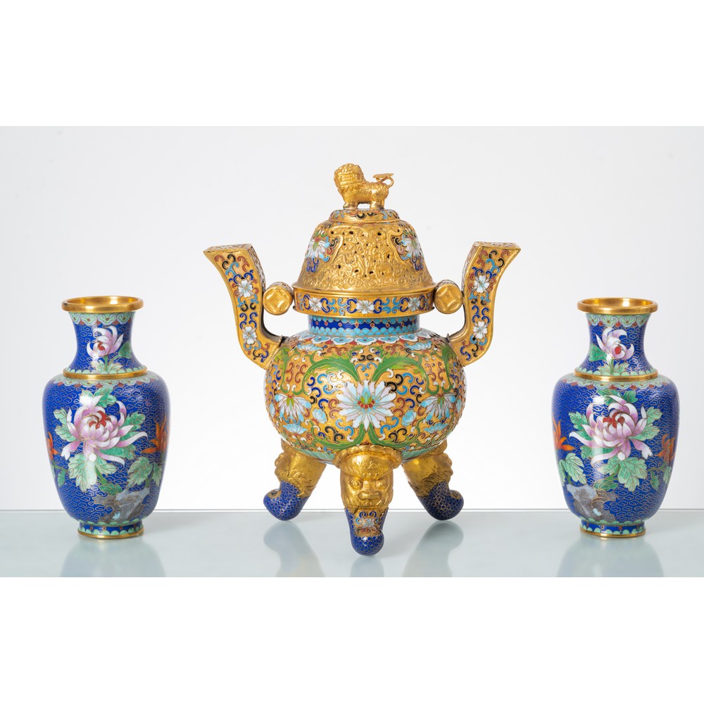 Coppia di vasi in cloisonné e incensiere tripode in cloisonné, coperchio con presa a guisa di cane di Fo e supporti con decori a mascheroni.