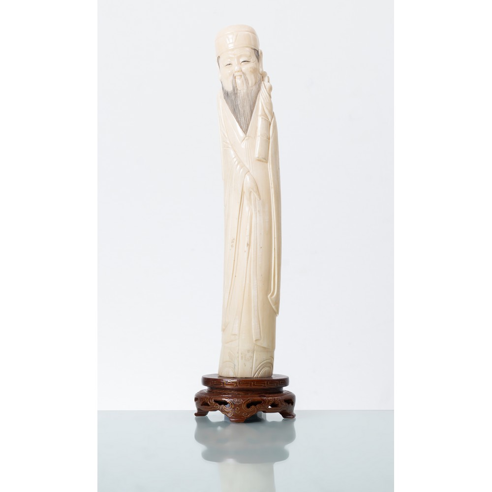 Scultura in avorio raffigurante "Saggio" con base in legno. L'opera è corredata di certificato Cites.