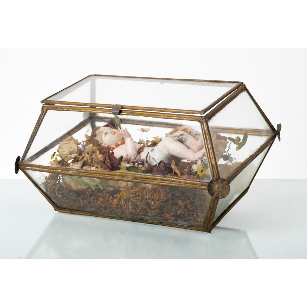 Bambinello in ceroplastica con applicazioni in corallo entro teca in vetro.