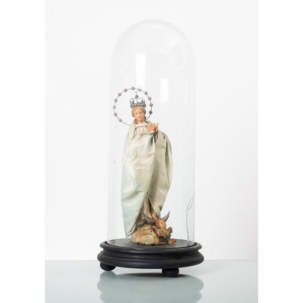 Scultura in ceroplastica raffigurante "Madonna" con corona stellare entro campana in vetro, base in legno (filature al vetro).