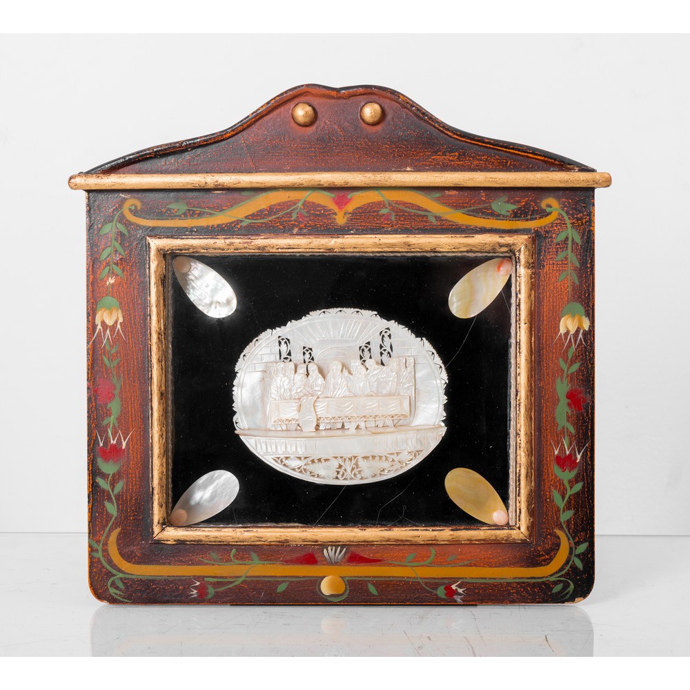 PLACCA in madreperla riccamente lavorata raffigurante "Ultima cena" entro teca in legno in parte dipinta.