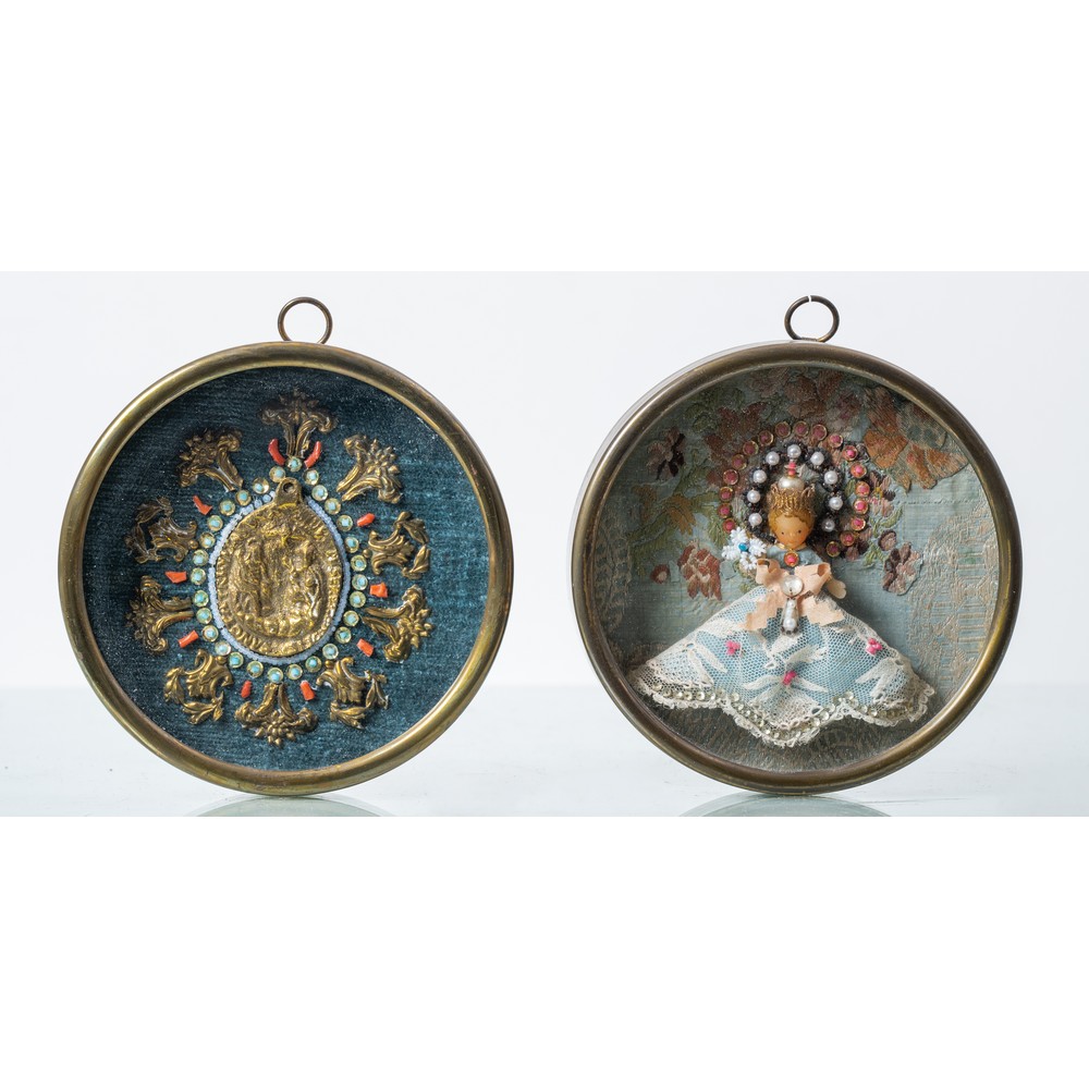 Due composizioni entro piccole teche di forma circolare di cui una in metallo dorato raffigurante "Natività" con coralli e turchesi ed una in cera con applicazioni in corallo e perline raffigurante "Bambinello".