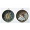 Due composizioni entro piccole teche di forma circolare di cui una in metallo dorato raffigurante "Natività" con coralli e turchesi ed una in cera con applicazioni in corallo e perline raffigurante "Bambinello".