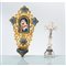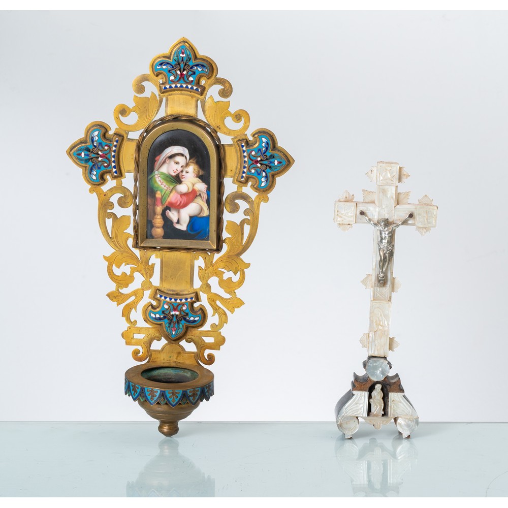 Acquasantiera in metallo dorato con gigli in cloisonné e placca in porcellana raffigurante "Madonna della Seggiola con Bambino" e crocifisso in madreperla (mancanze).