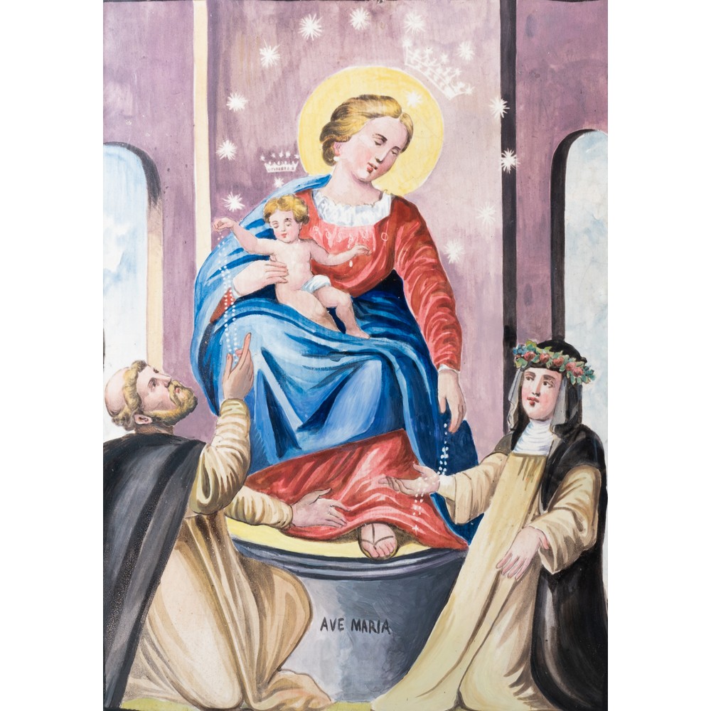 Mattonella in ceramica dipinta raffigurante "Madonna del Rosario di Pompei" (restauri).
