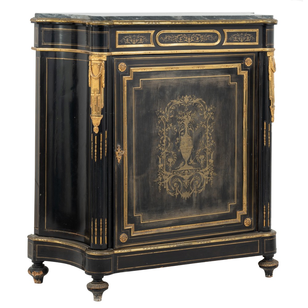 Piccola credenza di forma sagomata ad un'anta in ebano con tarsie in rame e guarnito da bronzi, piano in marmo grigio.