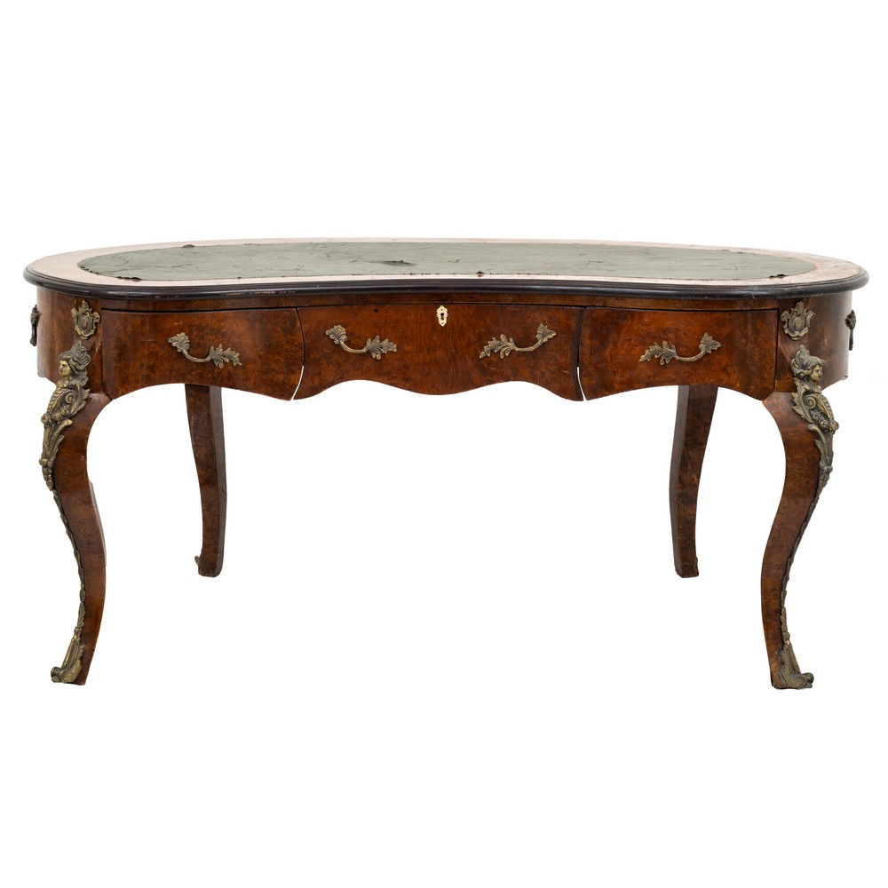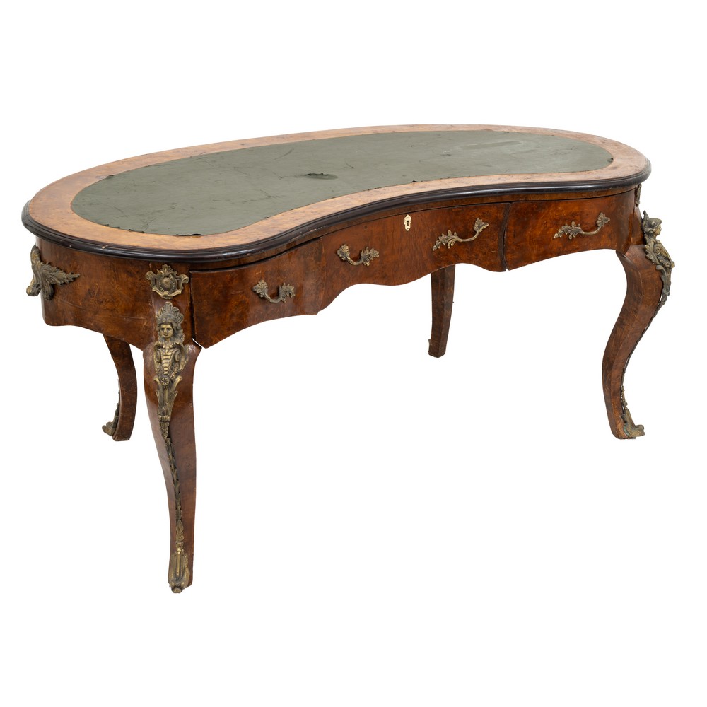 Grande scrivania a fagiolo stile Luigi XV in radica di tuja, elementi in bronzo.