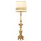 LUME da terra stile Luigi XV a tre fiamme in legno dorato con paralume in tessuto.