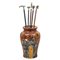 Grande vaso in ceramica smaltata e decorata e cinque bastoni con manici in metallo.