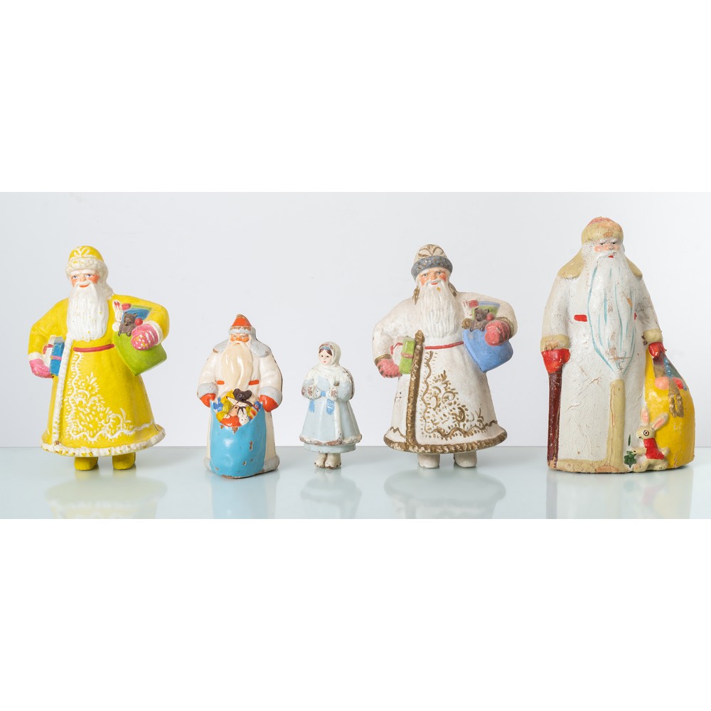 CINQUE SCULTURE in cartapesta di cui quattro raffiguranti "Babbo Natale" ed una raffigurante "Bambina".