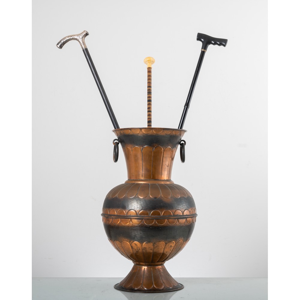 Vaso in rame sbalzato e tre bastoni in legno di cui uno con pomolo in osso ed uno con manico in metallo argentato.