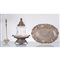 Ponchera con mestolo in metallo e cristallo; vassoio in metallo sbalzato, bordo centinato.