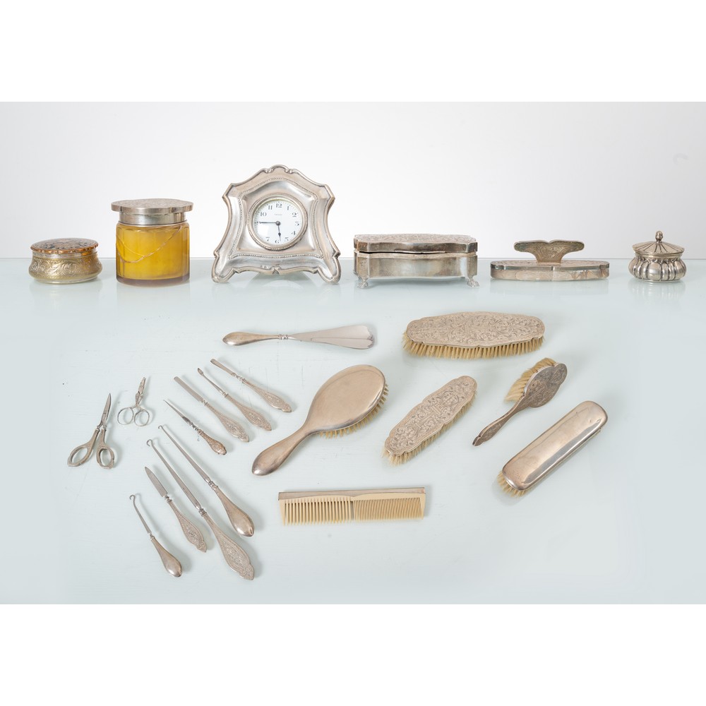 Servizio da toletta in metallo e argento composto da: 5 spazzole, orologio, 4 piccole scatole, calzascarpe, 2 piccole forbici, pettine, 3 tiralacci e 6 attrezzi per manicure (usure).