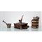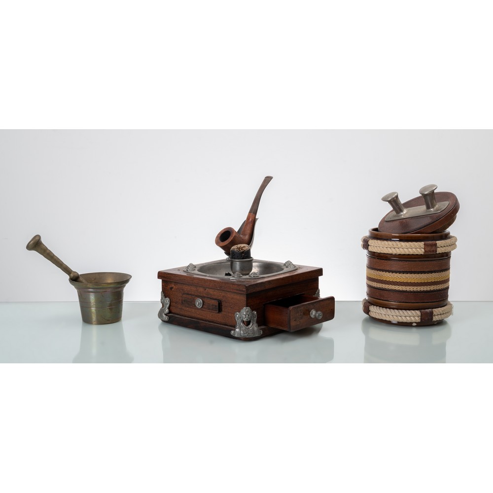 Posacenere con porta pipa e pipa. piccolo mortaio in bronzo con pestello e barattolo in ceramica, corda e metallo a motivo navale.