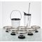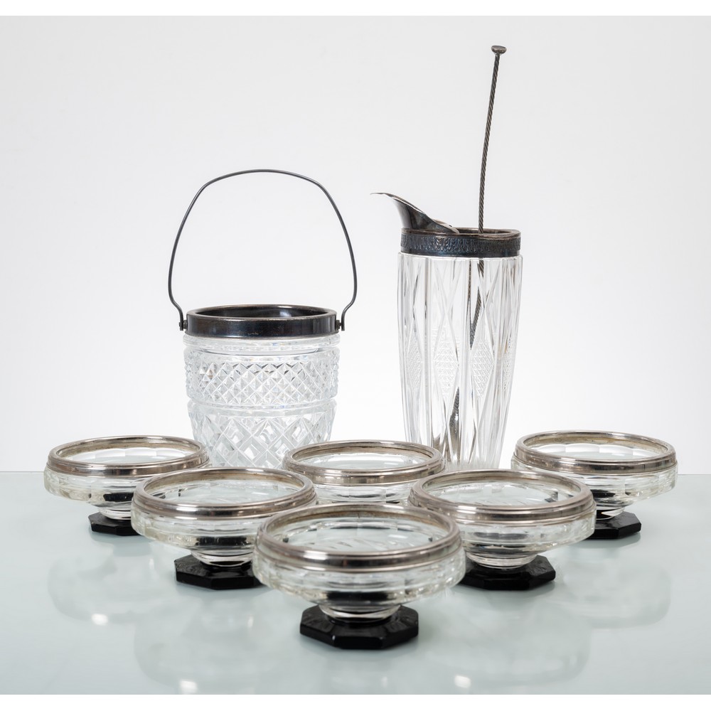 Sei tazze da macedonia in vetro e argento, secchiello portaghiaccio e mixer per cocktail in vetro e peltro.